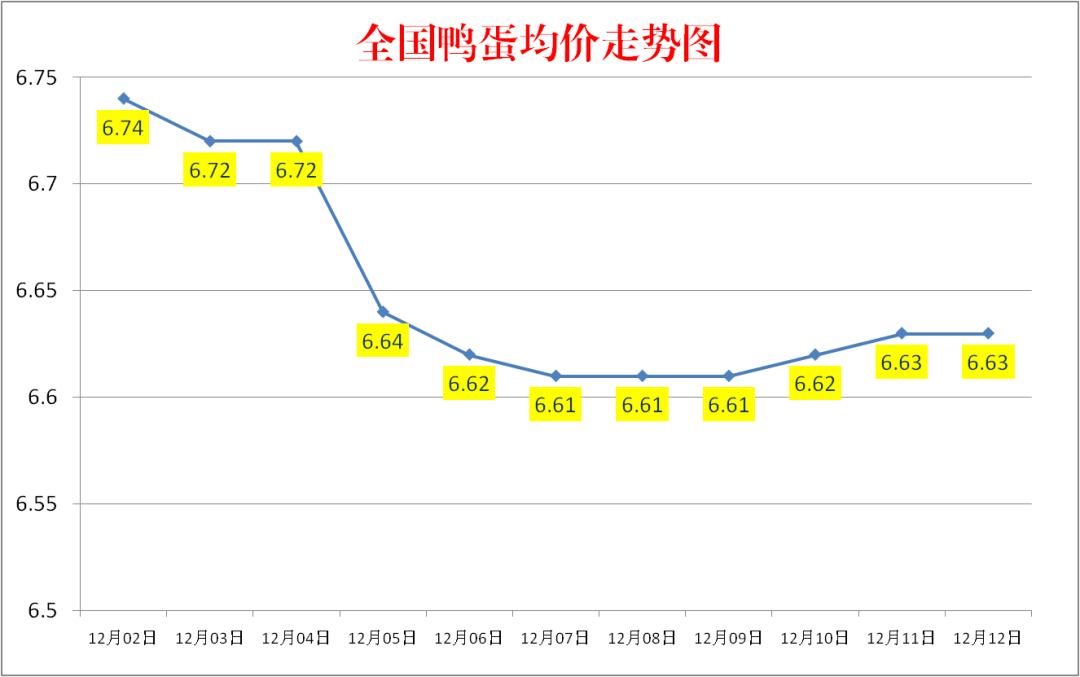 2022年12月14日全国鸭蛋价格稳定。今日鸭蛋平均收购价格6.63元/斤,今日最高收购价格7.3元/斤,最低6.2元/斤。